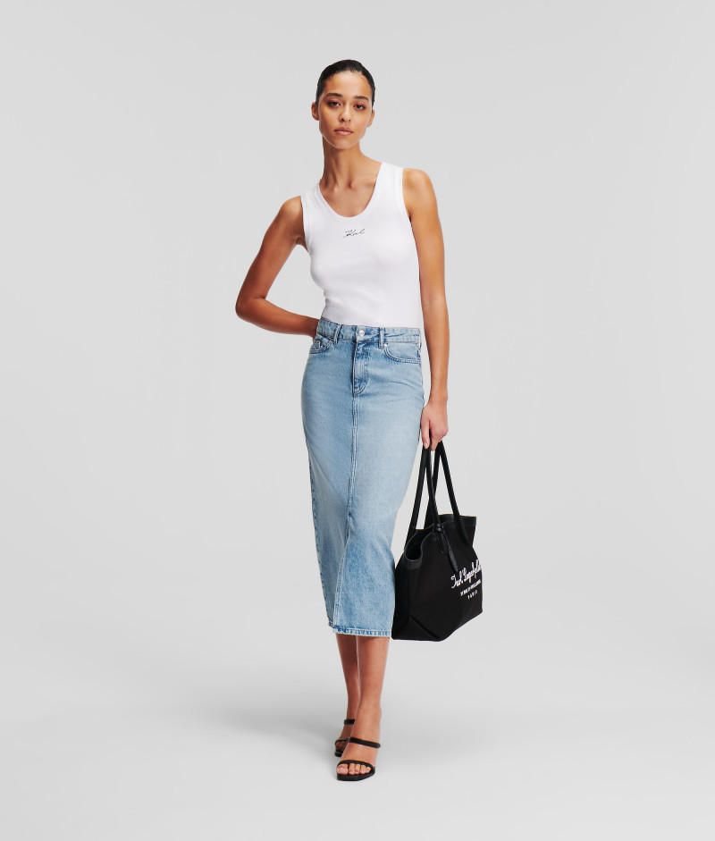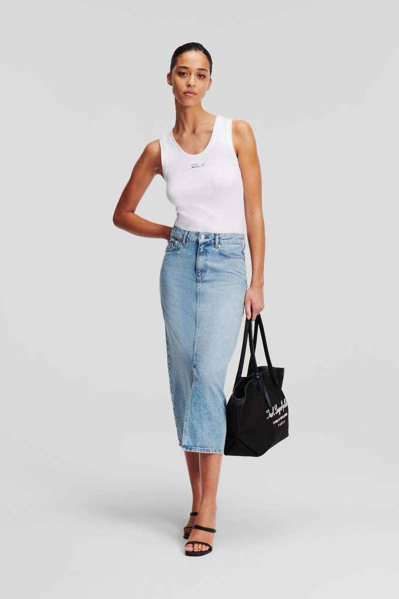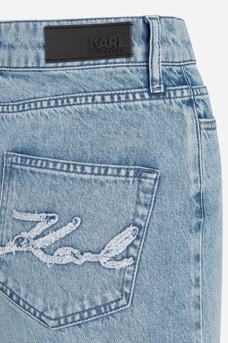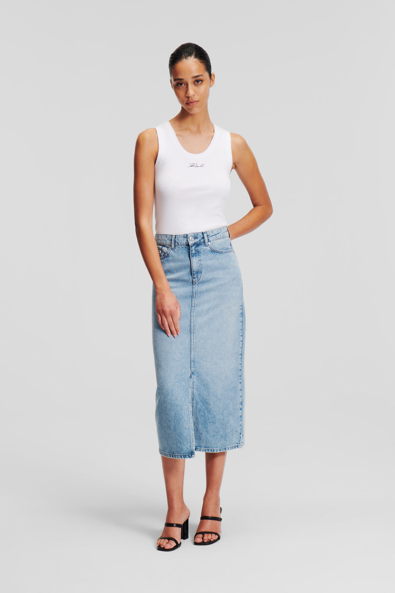 Dámska džínsová sukňa v midi dĺžke, ktorú zdobí efektný predný rozparok v stredovom šve. Puzdrový strih s vyšším pásom, piatimi vreckami a pútkami na opasok dopĺňa vyšité Karl Signature logo na zadnom vrecku a kožený štítok loga nad zadným vreckom. Odolná džínsová tkanina s prímesom lyocelu je pevná, nosením sa však stáva krásne prispôsobivou, mäkkou a veľmi príjemnou na dotyk. Výborne kombinovateľný kúsok v modernom strihu, ktorý štýlovo doplní Váš outfit.