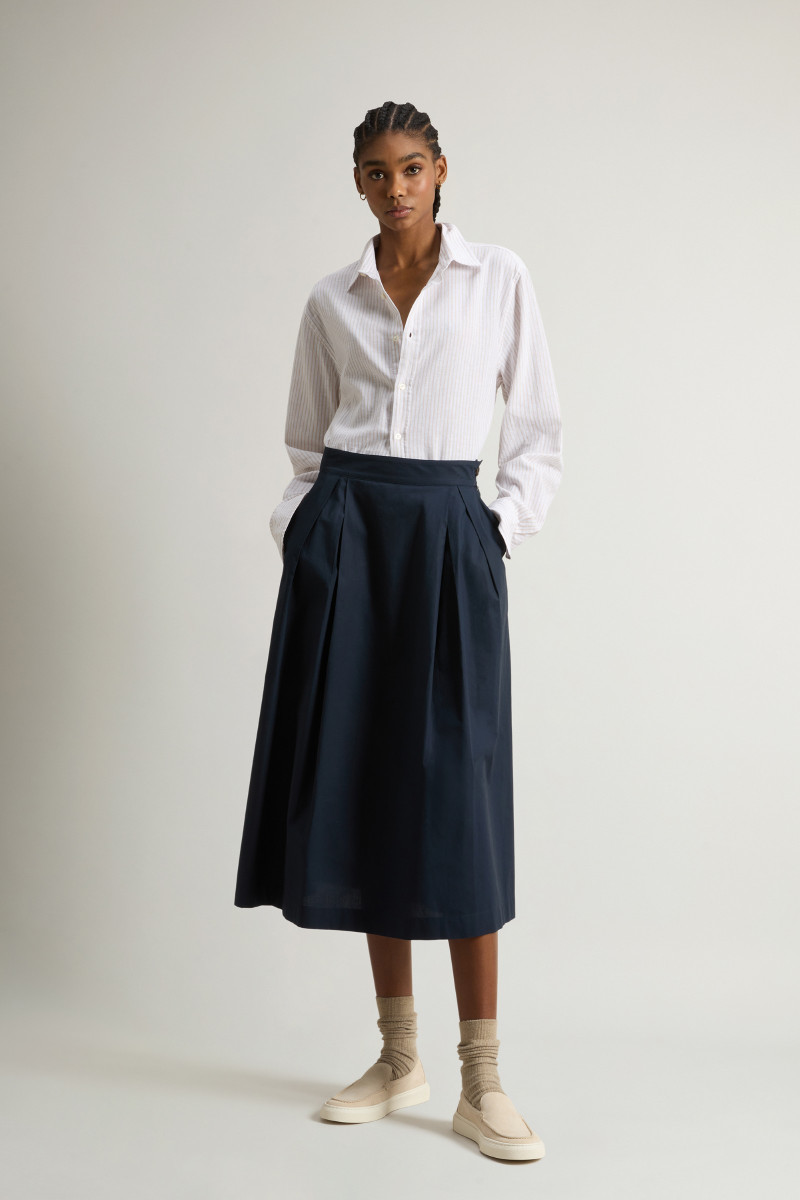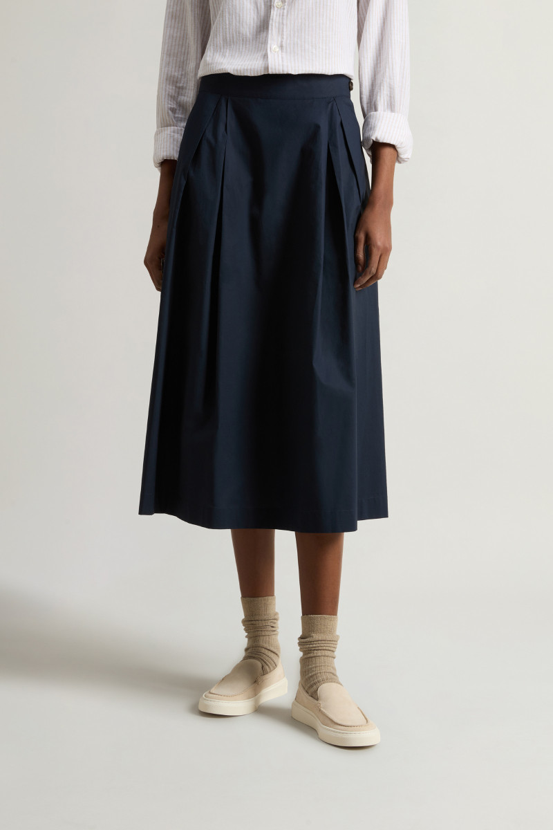 Dámska bavlnená midi sukňa s rovným strihom. Jednofarebný dizajn so stredne vysokým pásom a efektnými záhybmi na prednej strane dopĺňajú praktické bočné vrecká a zapínanie na gombík a zips na ľavej strane. Hladká popelínová tkanina z prvotriednej bavlny zaručuje dokonalú priedušnosť, ľahkosť a príjemné nosenie. Skvelý kombinovateľný kúsok, ktorý štýlovo doplní vaše športovo-elegantné a formálne oblečenie.