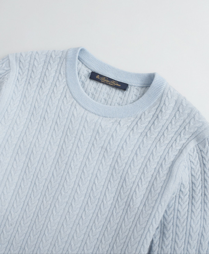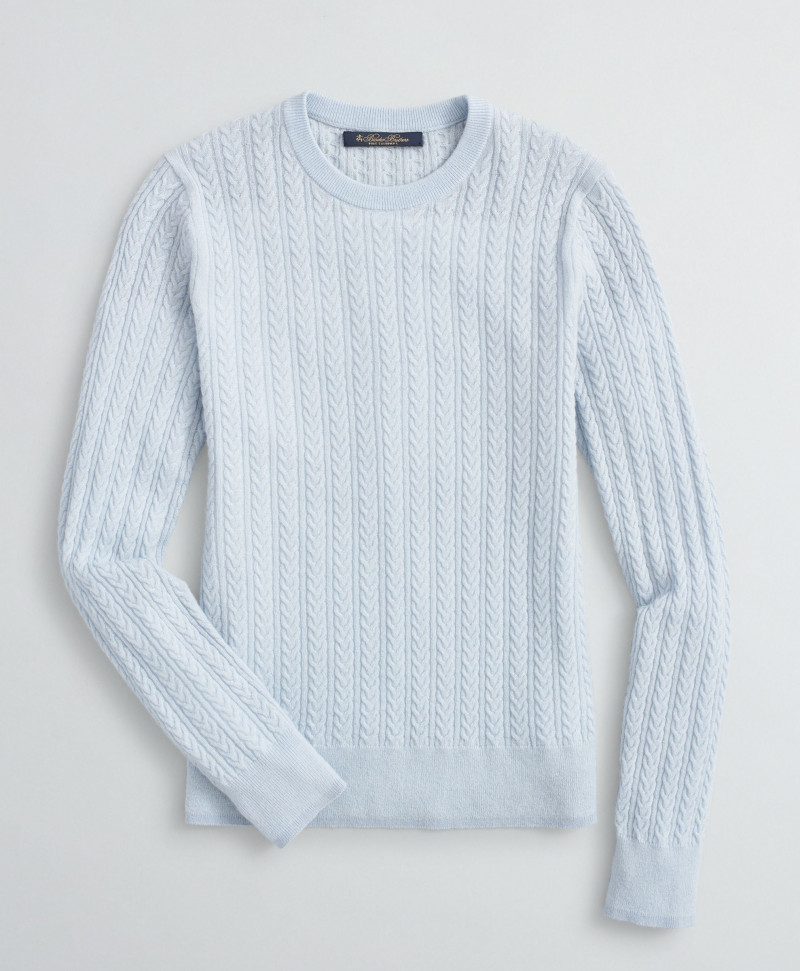 Dámsky sveter z kolekcie Brooks Brothers. Sveter s okrúhlym výstrihom mierne priliehavého strihu a jemným vrkočovým vzorom. Pás a rukávy sú zakončené pružným rebrovaným lemom. Luxusný sveter zo 100% kašmíru prémiovej kvality je zárukou neskutočnej jemnosti, ľahkosti, hrejivosti, mäkkého a príjemného pocitu počas nosenia. Skvelo sa kombinujúci nadčasový artikel, ktorý bude vaším najlepším spoločníkom do chladných dní.