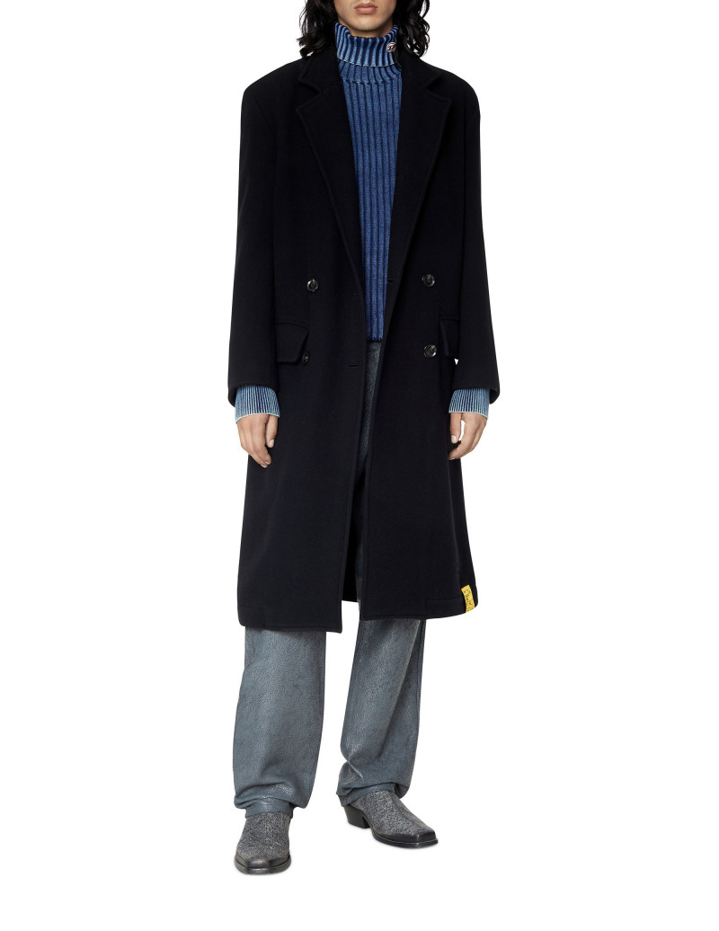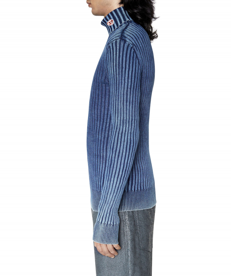 Pánsky rolák. Slim fit úzky padnúci strih. Tento rebrovaný robustný sveter je vytvorený z pravej indigovej priadze. Upravený metódou stonewashed pre docielenie vyblednutého odtieňa. Detail oválneho loga písmena „D“ na leme roláka. Rebrované manžety a lem. Model má na sebe veľkosť L a meria 188 cm.