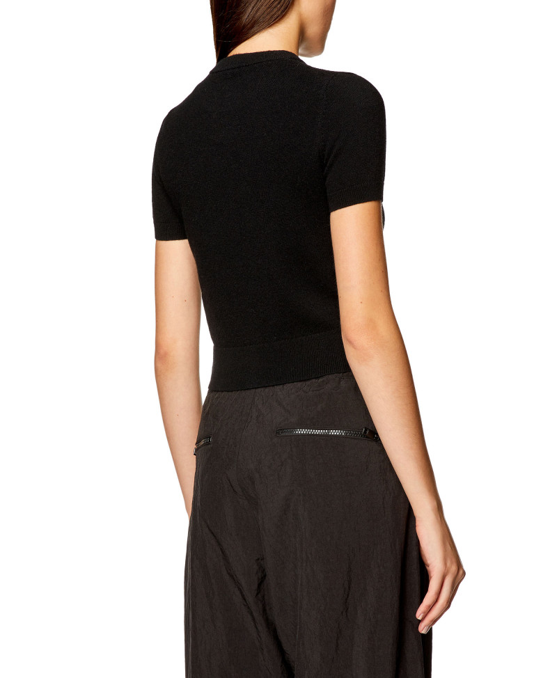 Dámsky top s krátkym rukávom. Upletený z luxusnej zmesi zodpovedne získanej vlny a recyklovaného kašmíru. Slim fit priliehavý strih s kratšou dĺžkou do pása. Vystrihnuté a vyšívané logo oválneho písmena ,,D odhaľuje časť kože priamo pod výstrihom. Pružné rebrované lemy. Modelka má na sebe veľkosť S a meria 175 cm.