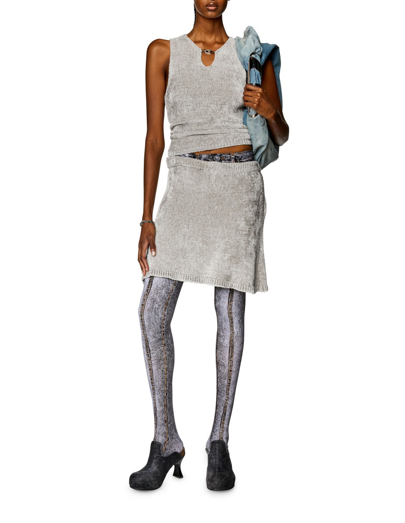 Dámske tielko. Užší rovný strih s výstrihom. Vyrobené z mäkkej a hebkej ženilky. Vysoká kvalita viskózovej priadze dodáva odevu trblietavý vzhľad. Vybavené kvapkovým výstrihom na prednej strane doplneným kovovou oválnou plaketou písmena „D“. Modelka má na sebe veľkosť S a meria 175 cm. Veľkosť zodpovedá bežnému značeniu.