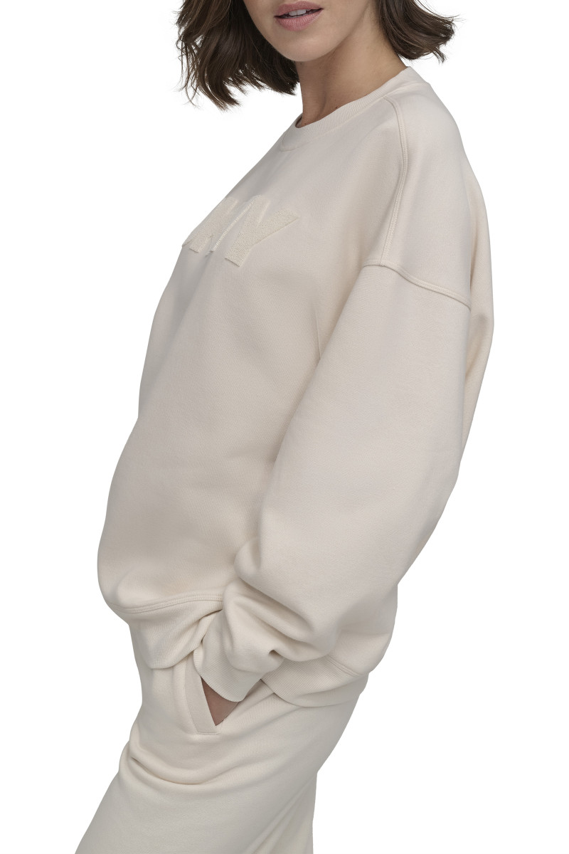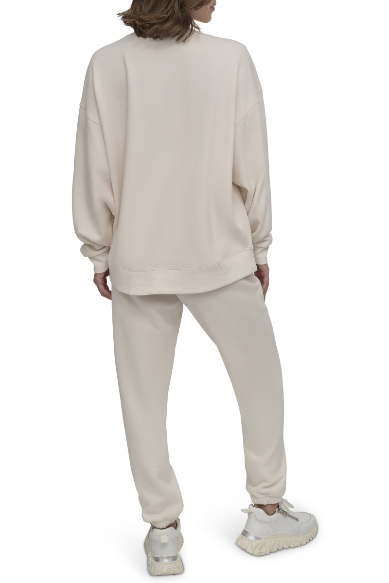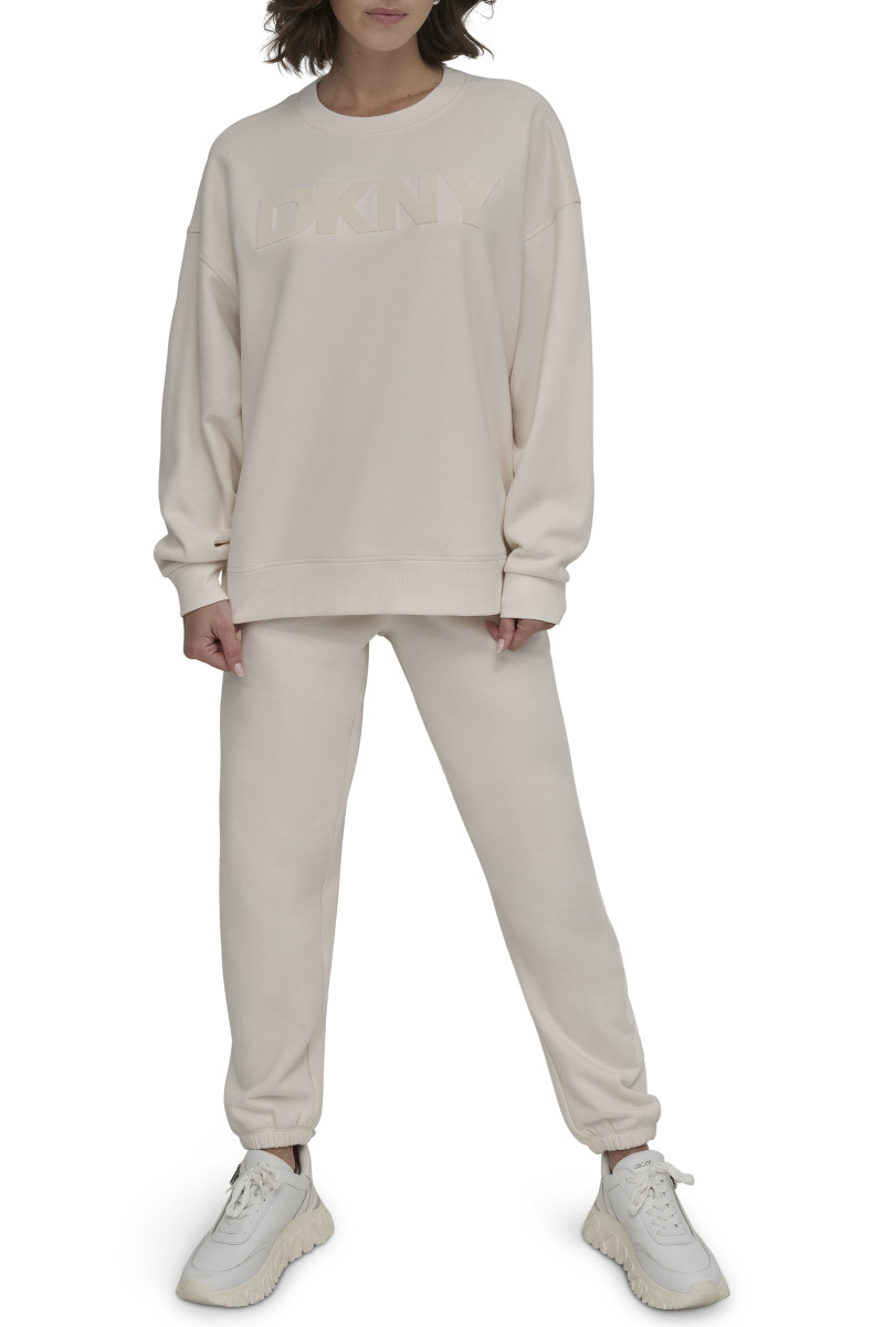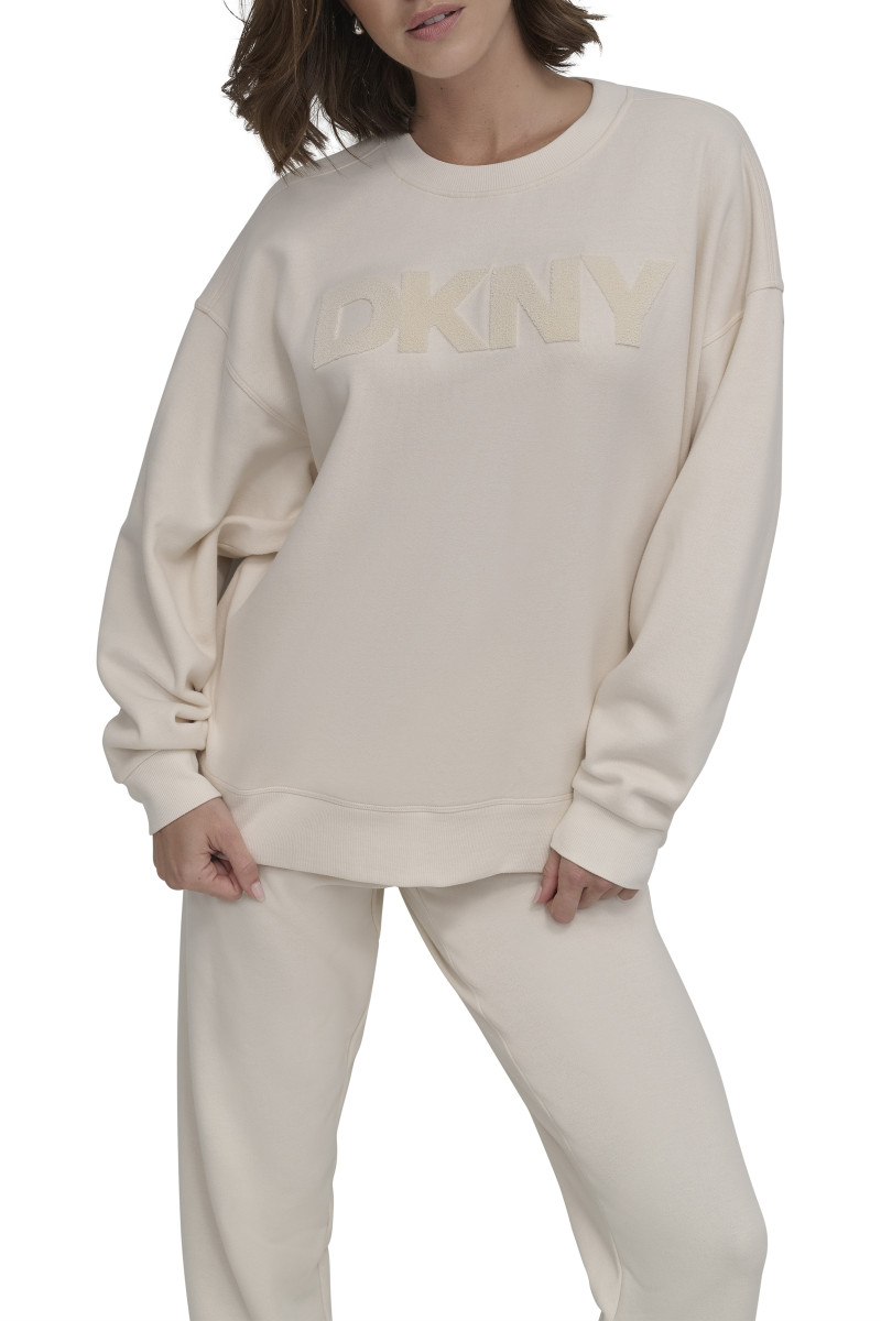 Dámsky sveter s okrúhlym výstrihom. Uvoľnený dizajn s mierne padnutými ramenami a rebrovaným lemom pri krku, v páse a na rukávoch dopĺňa originálne logo DKNY v tonálnej farbe umiestnené na hrudi. Mäkký bavlnený úplet zaručuje maximálne príjemný pocit počas nosenia a nenáročnú údržbu. Veľmi praktický a zároveň štýlový kúsok, ktorý skvele doladí Váš ležérny outfit.