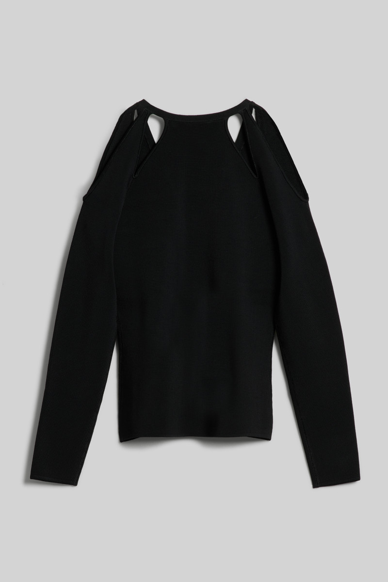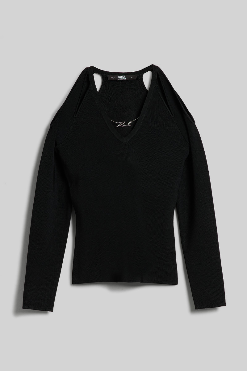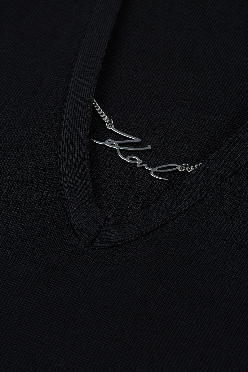 Dámsky úpletový sveter s dlhým rukávom a vyrezávanými detailmi. Tento odvážny rebrovaný úplet má výstrih do V, ktorý je zdobený striebornou retiazkou s logom Karl. Vyrobený z ultra mäkkej viskózy v štíhlej siluete.