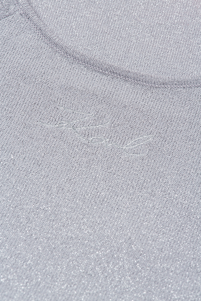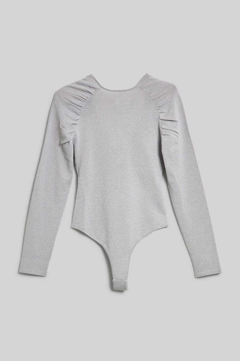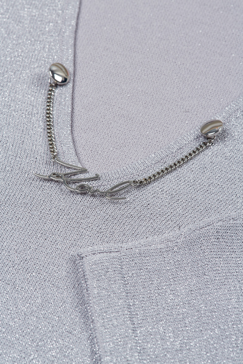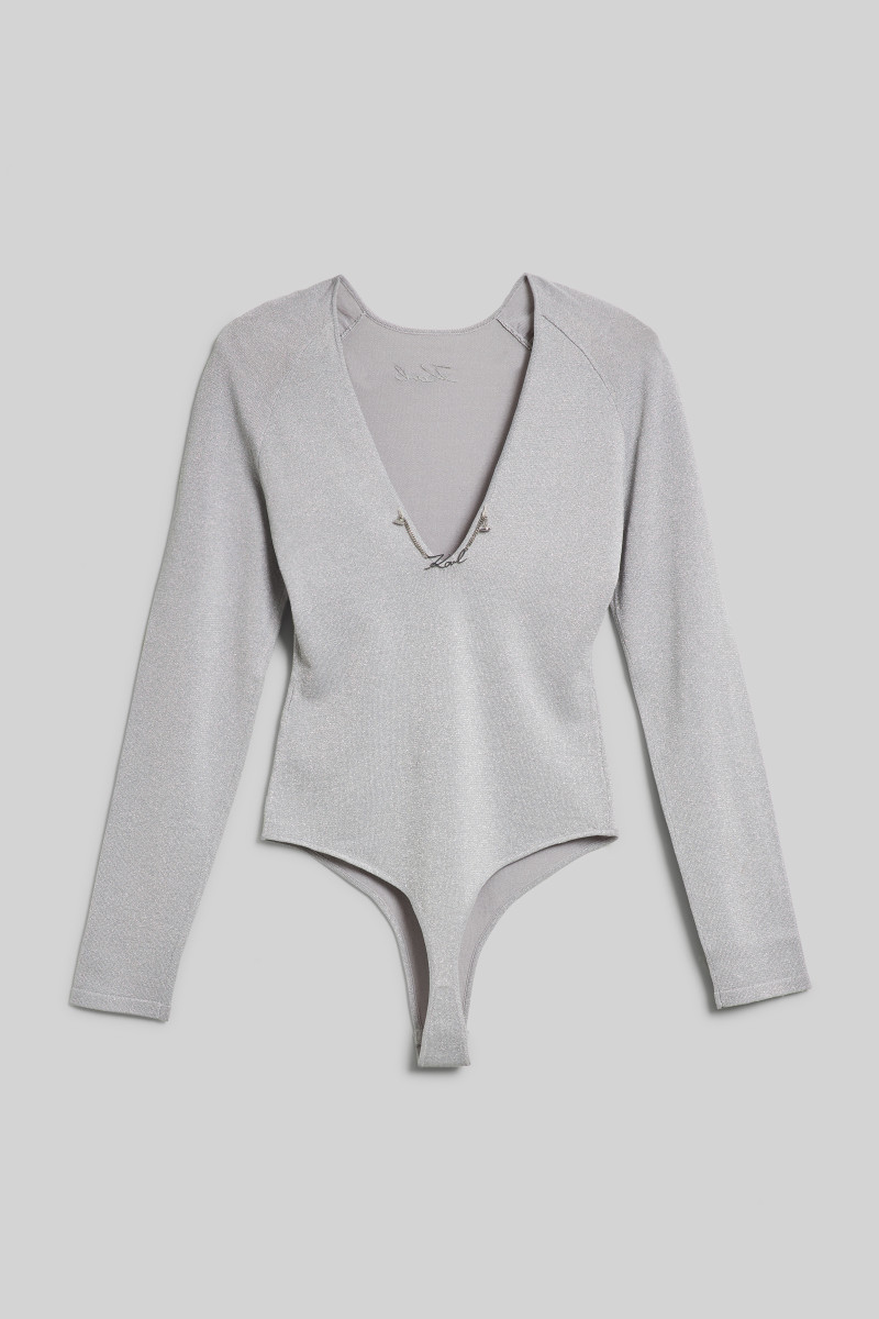 Dámske body s dlhým rukávom. Priliehavý strih ušitý s metalickou niťou, vďaka ktorej je tento sveter lesklý. Nazbierané prešitie na prednej časti vytvára zaujímavý detail. Vykrojený chrbát je ukončený retiazkou s logom Karl Lagerfeld. Zapínanie na patenty. Materiálové zloženie zaručuje dokonalú mäkkosť, priedušnosť a maximálne príjemný pocit pri nosení. Nezameniteľne štýlový kúsok, ktorý bude ozdobou Vášho outfitu.