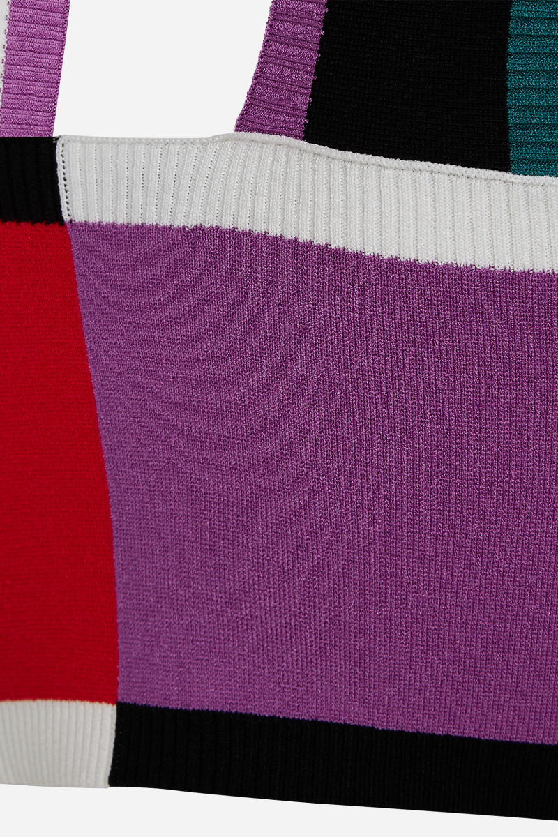Avantgardný úpletový top bez ramienok, so štruktúrovaným vzorom farebných blokov. Skrátenému topu dodávajú na osobitosti unikátny obrátený pásik cez krk. Dokonale sa hodí k zladenej úpletovej ceruzkovej sukni.