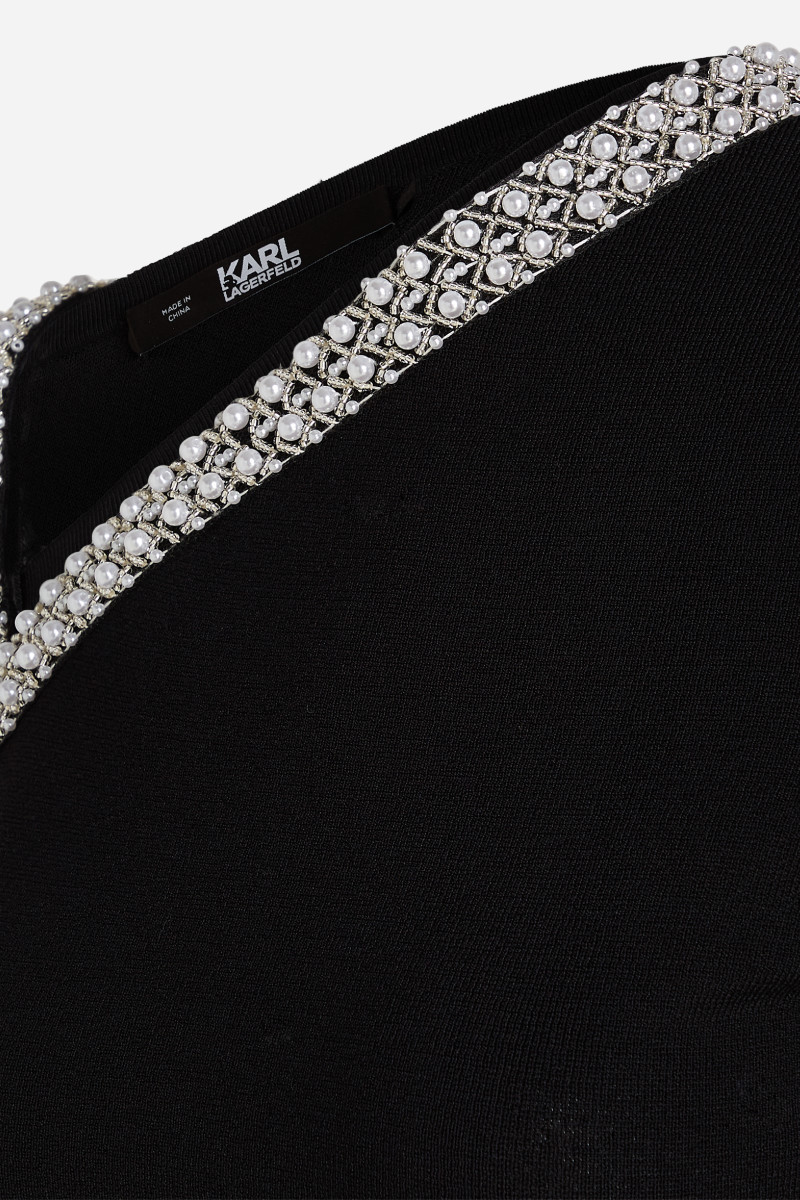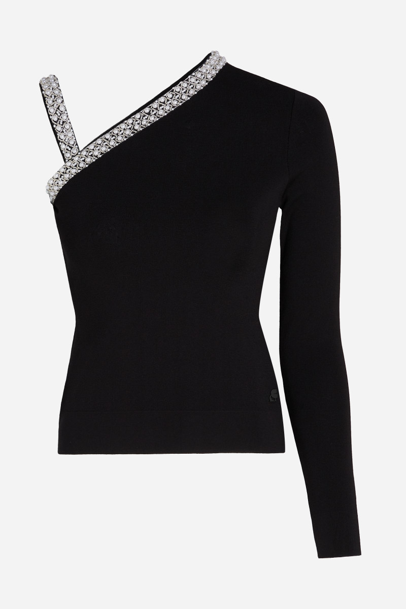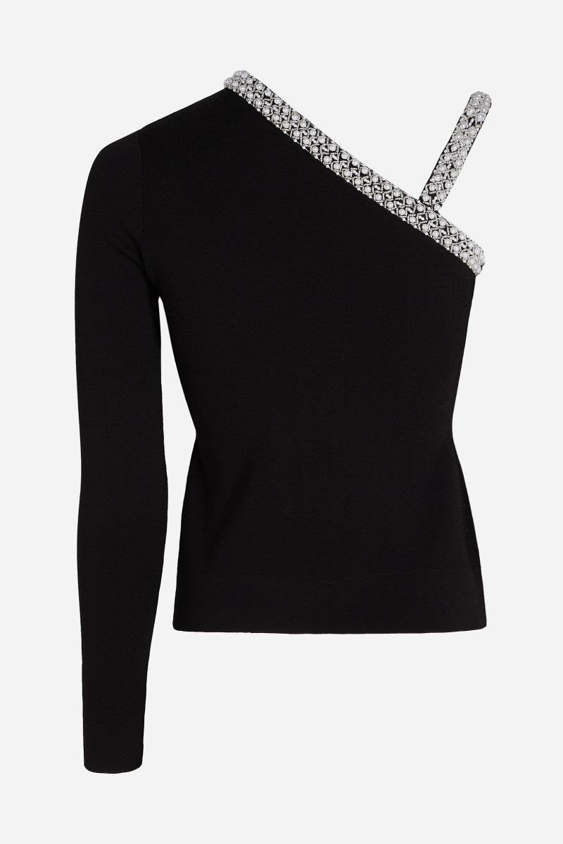 Tento elegantný top na jedno rameno je vyrobený z veľmi mäkkého milánskeho úpletu a zdobia ho jemné perly a korálky. Vezmite s k nemu sukňu dvoch prekrývajúcich sa dielov a vytvorte elegantný set.