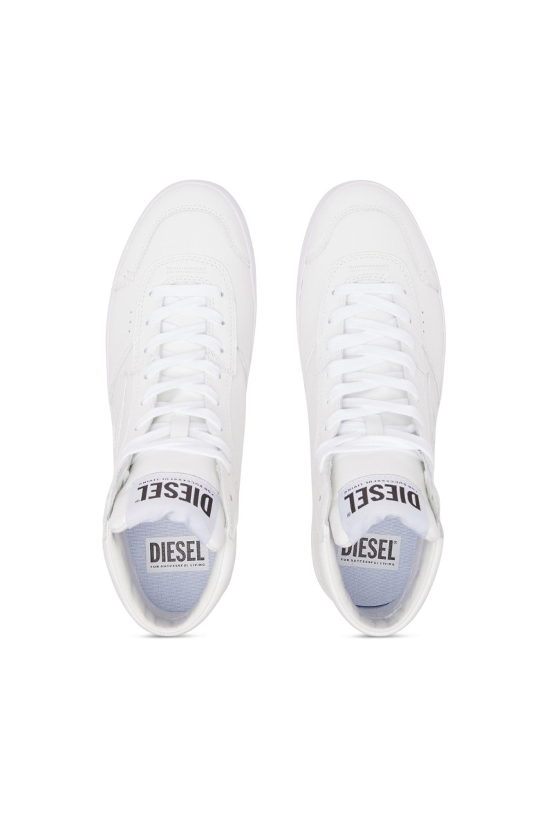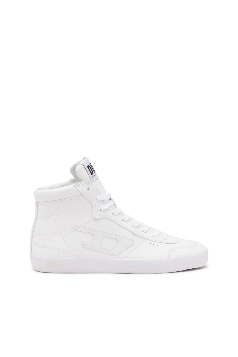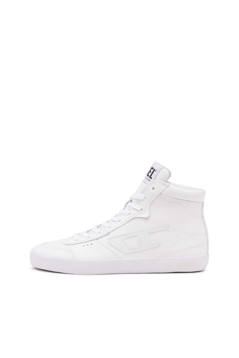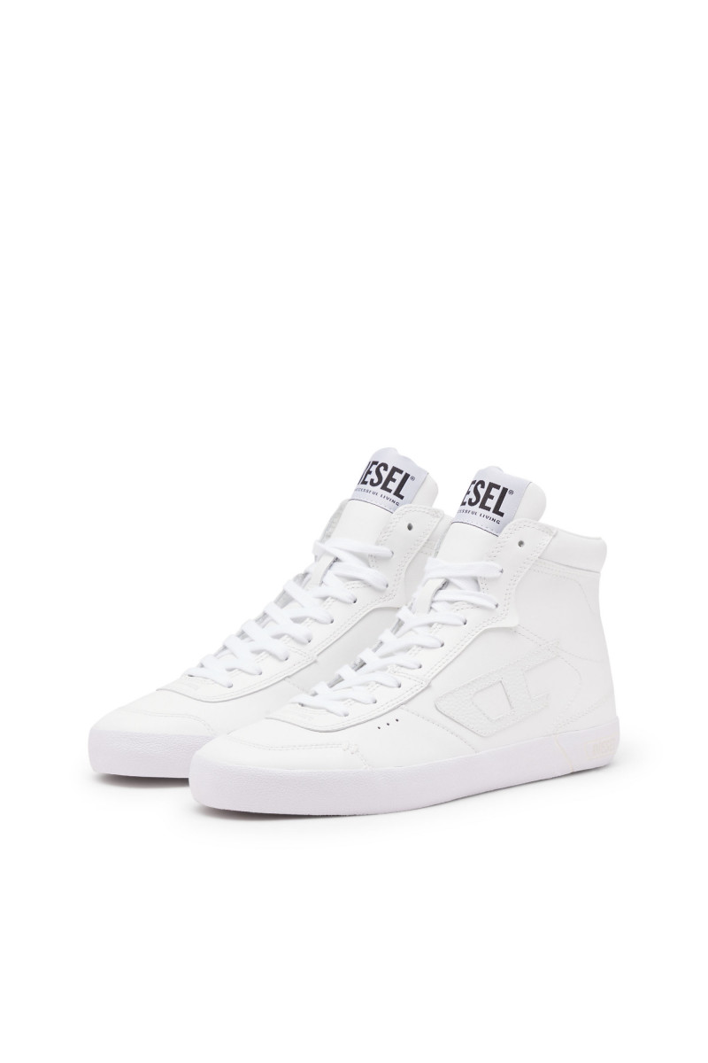 Dámske vysoké kožené tenisky. Tieto topánky sa zapínajú na šnúrky a majú minimalistický monochromatický vzhľad kompenzovaný nápadnou červenou gumenou podrážkou. Tónové nášivky D emblémy charakterizujú boky.