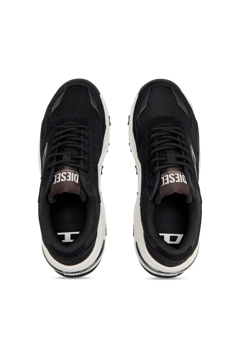 Dámske tenisky v športovom štýle. Bielo čierny dizajn kombinovaný s hladkým povrchom a extra vyvýšenou gumenou podrážkou. Športový dizajn dopĺňa tonálne logo Oval D na vonkajšej strane. Jazyk zdobí tepelne lisovaný štítok s logom Diesel For Successful Living. Šnurovanie na šnúrky. Detail loga umiestnený na komfortnej odpruženej podrážke v zadnej časti. Nezameniteľne štýlová a pohodlná obuv, ktorá skvele doladí Váš neformálny outfit.