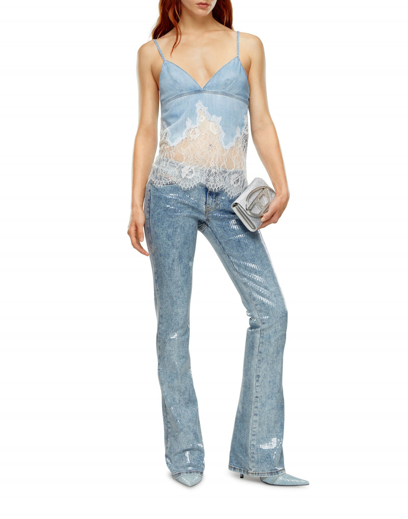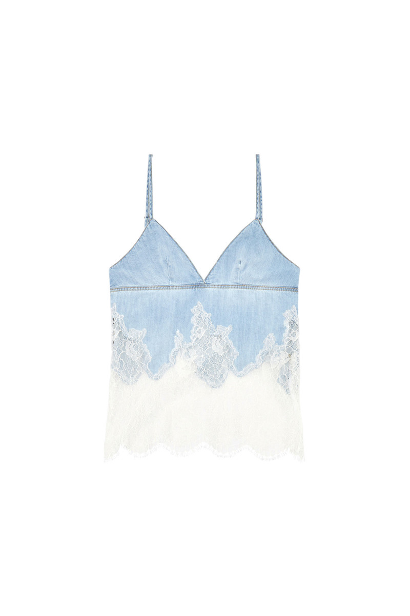 Dámsky top so špagetovými ramienkami a výstrihom do V. Vyrobený zo svetlomodrej džínsoviny v kombinácií s lyocellom, vďaka ktorému je látka mäkká a pružná. Obohatený o biele vložky z priehľadnej čipky na leme. Zadnú stranu zdobí malá kovová oválna D iniciálka, tesne pod pravým remienkom. Modelka má na sebe veľkosť S a meria 175 cm. Veľkosť zodpovedá bežnému značeniu, pri výbere si prosím vyberte svoju bežnú veľkosť.