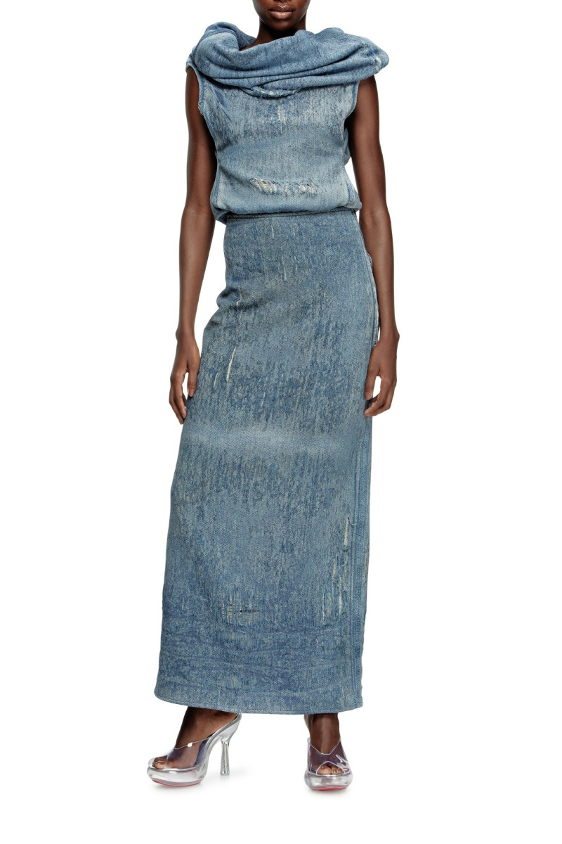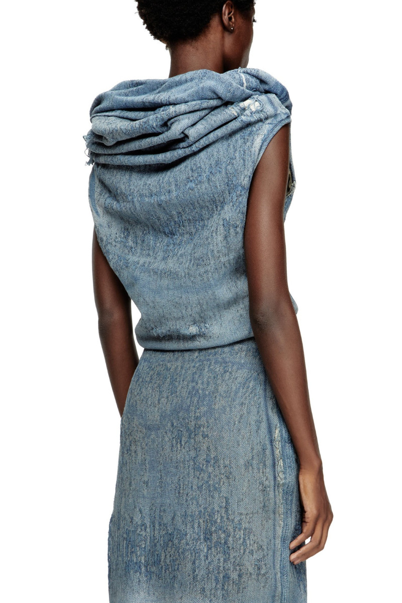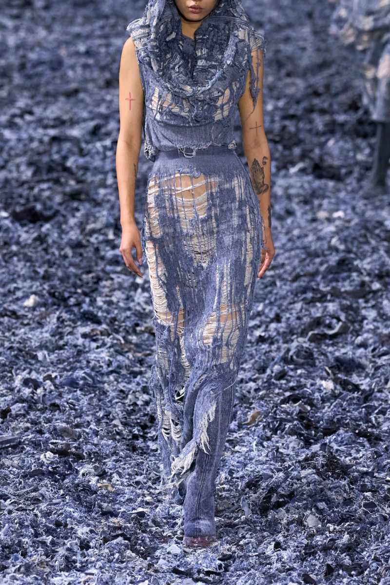 Dámsky top bez rukávov. Super voľná silueta s naberaným výstrihom, ktorý možno nosiť aj ako kapucňu. Ultra opotrebovaná tkanina, vyrobená s použitím organickej bavlny, je dokonalým príkladom nájdenia krásy v tom, čo je zničené – kľúčová téma prehliadky jar-leto 2025. Žakárová látka je tkaná na dvojitom tkáčskom stave, čím vzniká špecifická konštrukcia, ktorá obracia vzhľad tradičného džínsu: na prednej strane vynikajú dlhé indigové nite, zatiaľ čo biele nite zostávajú na vnútornej strane. Tento neočakávaný kontrast dodáva štýlu hĺbku a dynamiku. Modelka má na sebe veľkosť S a meria 175 cm.