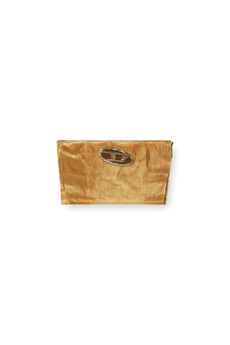 Dámsky top bez ramienok. Priliehavá skrátená silueta v džinsovom dizajne zdobená vyrezávanou kovovou sponou v tvare ikonického, oválneho loga D. Vyrobený z prírodne zafarbeného denimu zemitými pigmentmi. Špeciálne upravený metódou pieskovania a stonewash, vďaka čomu pôsobí vintage vzhľadom s prirodzene opotrebovanými miestami. Zapínanie na bočný zips. Modelka má na sebe veľkosť S a meria 175 cm.