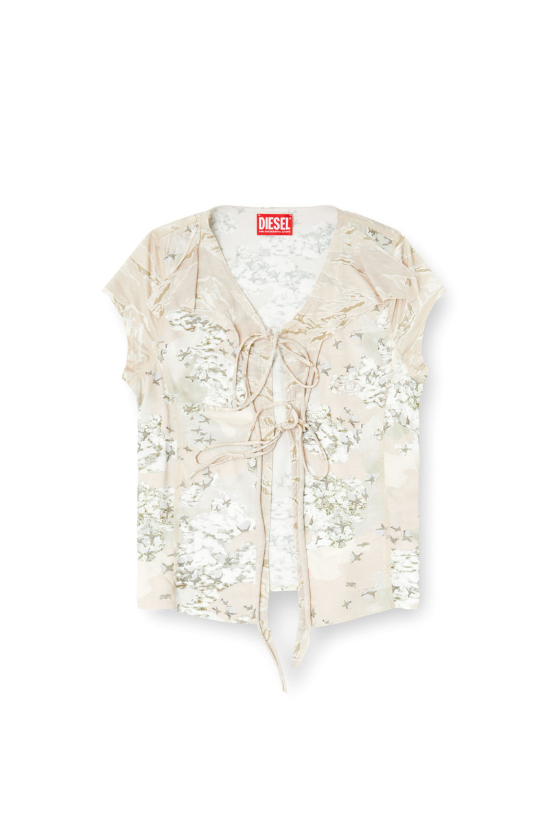 Dámsky top s krátkym rukávom. Slim fit úzky strih tvaruje postavu. Vyrobený zo strečového nylonu. Dizajn je tvorený panelmi z béžových maskáčových potlačí. Siluetu lemujú surovo strihané volány. Originálne zapínanie jemnými viazacími šnúrkami, ktoré odhaľujú kožu. Na hrudi zdobený vyšívaným logom ikonického písmena D. Modelka má na sebe veľkosť S a meria 175 cm. Veľkosť zodpovedá bežnému označeniu, pri výbere zvoľte svoje obvyklé číslo.