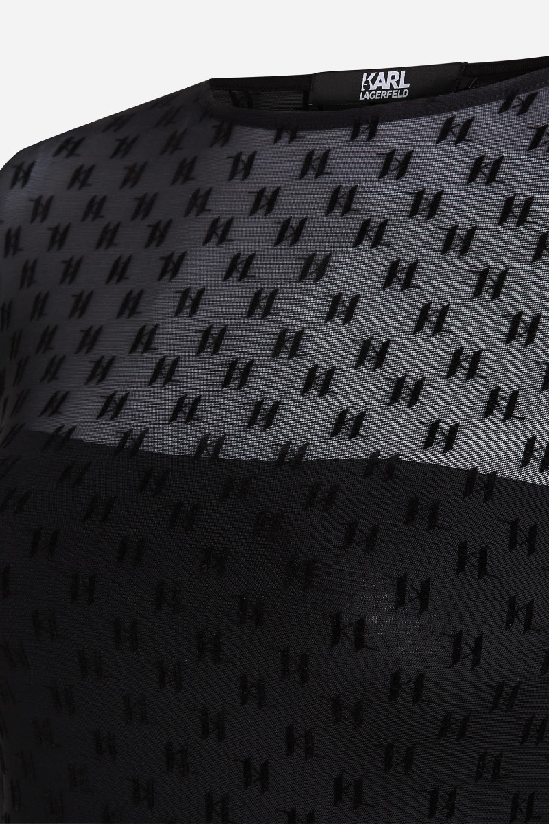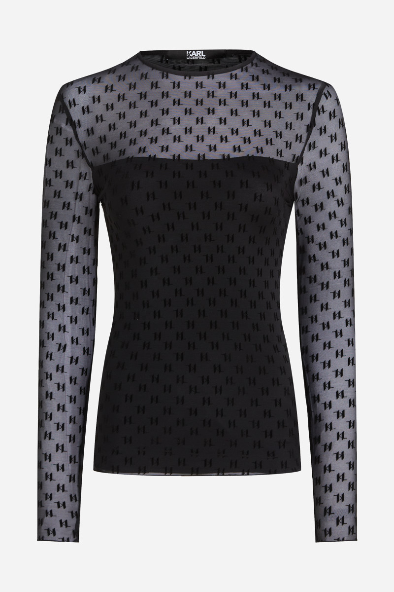 Dámsky sieťovaný top s dlhým rukávom a okrúhlym výstrihom. Polopriehľadný, priliehavý dizajn je zdobený celoplošným monogramom Karl Lagerfeld. Súčasťou je podšívka v čiernej farbe. Materiálové zloženie zaručuje dokonalú pružnosť a príjemný pocit pri nosení. Nezameniteľne štýlový kúsok, ktorý bude ozdobou Vášho denného aj večerného outfitu.
