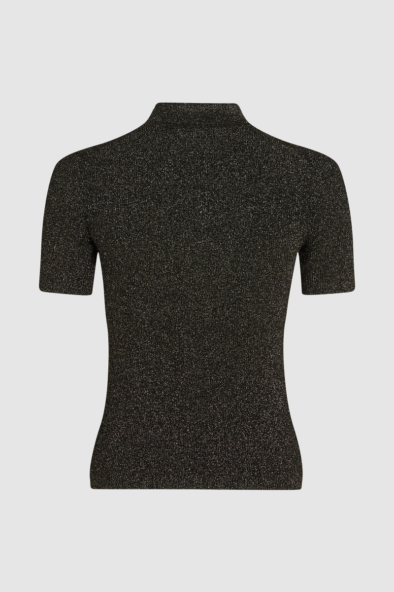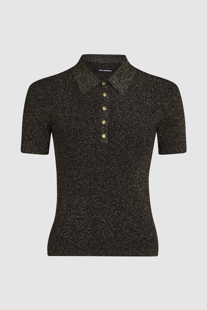 Dámske polo tričko s krátkym rukávom a golierom s gombíkovou légou. Priliehavý strih v trblietavom lurexovom dizajne doplnený zlatými gombíkmi s logom Karl Autograph. Materiálové zloženie je tvorené prémiovou viskózou, ktoré vyniká svojou príjemnou mäkkosťou. Jemnosť vlákna v kombinácii s dokonale sediacim strihom sú zárukou vysoko komfortného pocitu v priebehu nosenia. Veľmi štýlový a komfortný kúsok, ktorý bude ozdobou Vášho ležérneho outfitu.