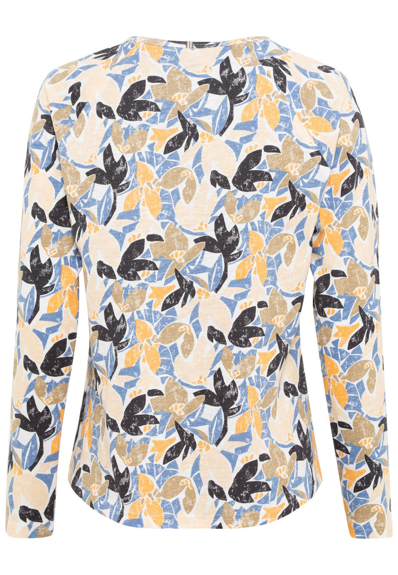 Dámske kvetované tričko s dlhým rukávom a okrúhlym výstrihom. Bavlnený úplet je dokonale pružný, tvarovo stály, komfortný na nosenie a jednoduchý na údržbu. Veľmi praktický kúsok, ktorý sa výborne hodí ako spodná vrstva pod sako alebo sveter a skvele tak doladí každý Váš športovo ležérny outfit.