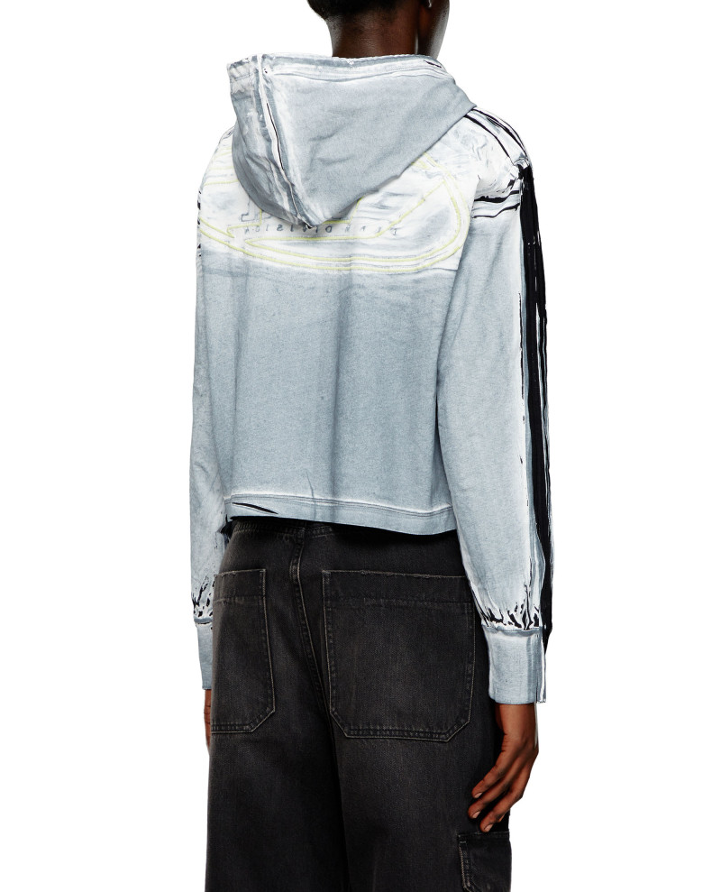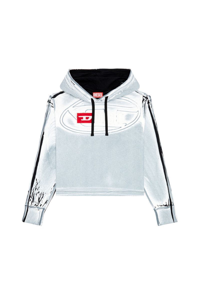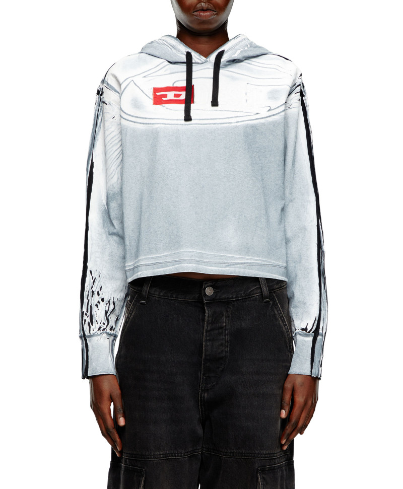 Dámska mikina s kapucňou. Voľný loose fit strih so spadnutými ramenami a skrátenou dĺžkou do pása. Vyrobená z bavlneného džerseja dodatočne potiahnutého farebným filmom, ktorý je miestami zámerne popraskaný a vďaka tomuto originálnemu efektu presvitá kontrastný čierny podklad. Hruď a chrbát zdobí embosované ikonické logo Oval D kombinované s logom D Diesel. Kapucňa so sťahovacou šnúrkou. Modelka má na sebe veľkosť S a meria 173 cm. Veľkosť zodpovedá bežnému značeniu, pri výbere zvoľte svoje obvyklé číslo.
