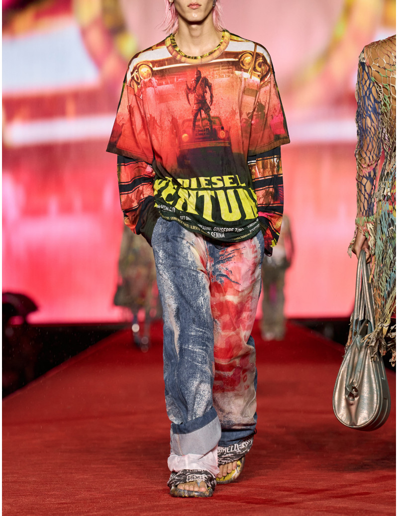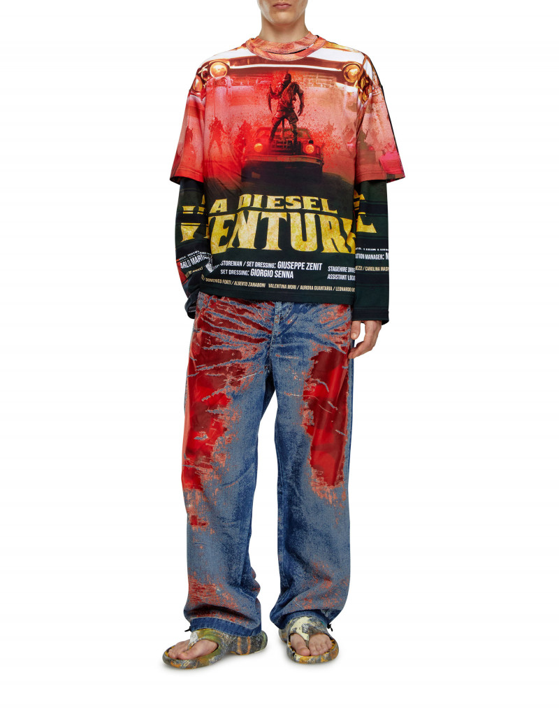 Pánske oversize tričko rovného strihu s krátkymi rukávmi a s okrúhlym výstrihom. Celoplošný dizajn na tričku zobrazuje plagát k fiktívnemu akčnému trháku spoločnosti Diesel. Materiálové zloženie je tvorené 100% bavlneným vláknom, ktoré je príjemne mäkké na dotyk, pri nosení priedušné a vďaka svojej poddajnosti a flexibilite aj veľmi pohodlné. Kvalitný džersej je zárukou tvarovej aj farebnej stálosti. Štýlový základ voľnočasového stylingu. Model má na sebe veľkosť L a meria 182 cm.
