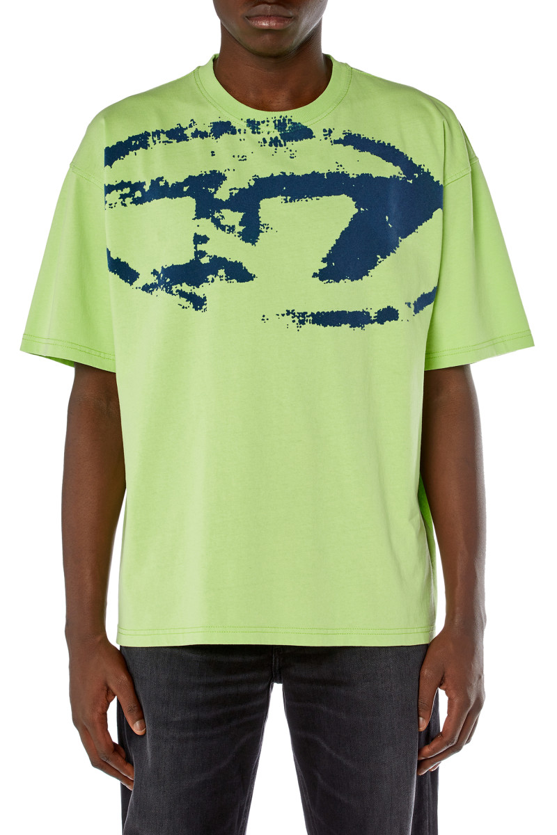 Pánske oversize tričko s krátkym rukávom. Voľný rovný strih. Ušité z bavlneného džerseja so štruktúrovaným povrchom. Zdobené mega veľkým oválnym logom písmena „D“ vyrazenom na prednej strane – print je tvorený spôsobom, ktorý napodobňuje prirodzené korodovanie materiálu spôsobené rokmi nosenia. Model má na sebe veľkosť L a meria 182 cm. Nákupom bavlnených produktov od Diesel podporujete zodpovednú produkciu bavlny prostredníctvom Better Cotton.