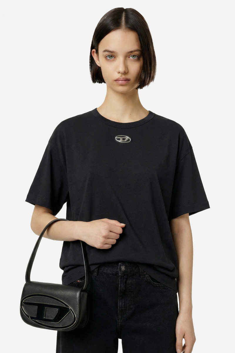 Dámske tričko s krátkym rukávom. Rovný voľný regular fit strih s okrúhlym výstrihom. Vyhotovené z mäkkého bavlneného džerseja. Na prednej strane hrudi zdobené vstrekovanou potlačou strieborného loga v tvare ikonickej Oval D. Upravené metódou stone wash pre mäkký dotyk a ľahký vintage vzhľad. Modelka má na sebe veľkosť S a meria 175 cm. Veľkosť zodpovedá bežnému značeniu, pri výbere zvoľte svoje obvyklé číslo.