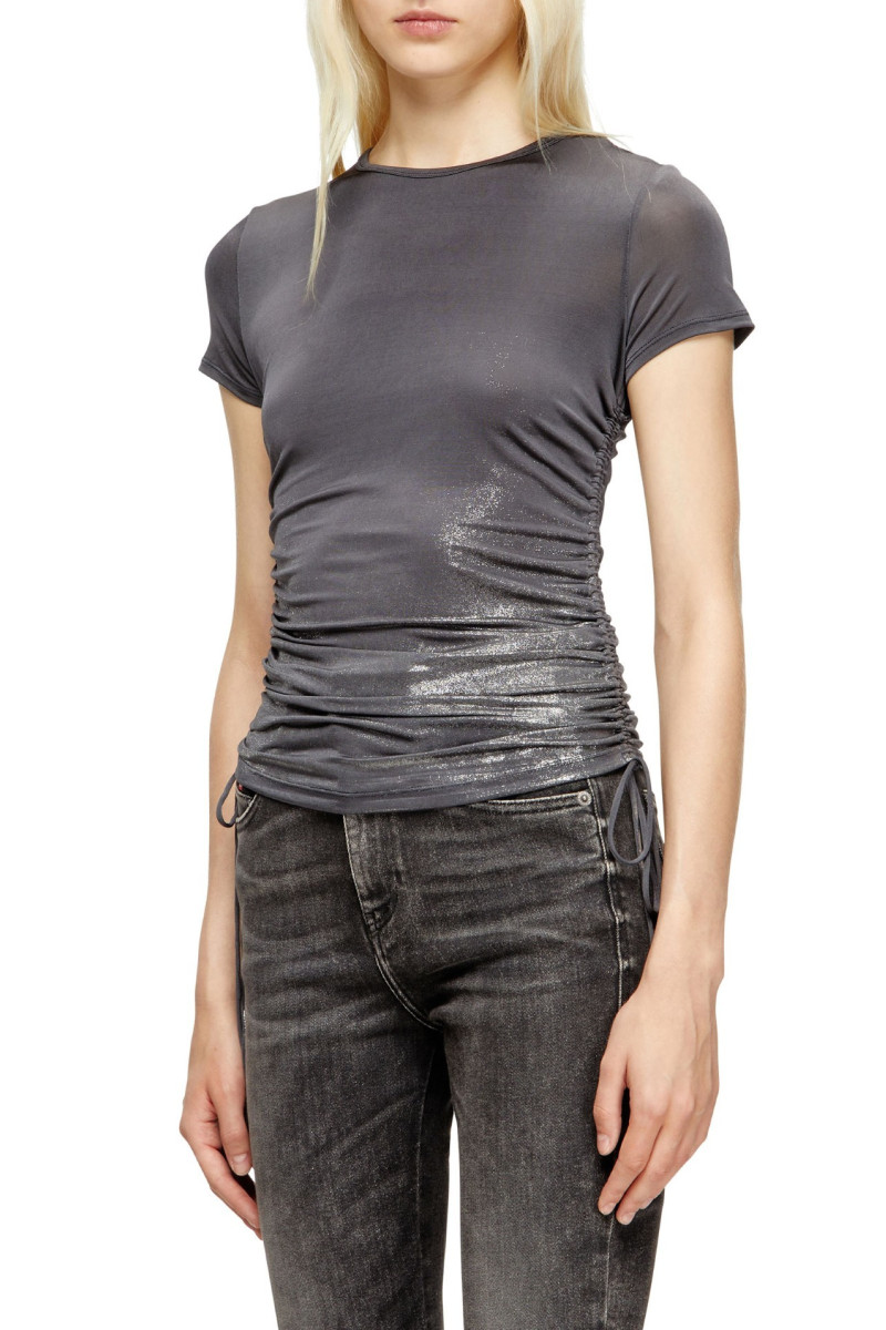 Dámsky top s krátkym rukávom. Úzky priliehavý strih s okrúhlym výstrihom. Vyrobený z džerseja s miernou elasticitou pre ideálne kopírovanie postavy. Dĺžka je nastaviteľná vďaka bočným zadrhovacím šnúrkam na zaväzovanie, ktoré dodávajú dizajnu nádych originality. Na chrbte je malá kovová plaketa v tvare ikonického loga Ovál D. Aplikácia gradientnej fólie zo spodnej strany vytvára dynamický a moderný vizuálny efekt. Modelka má na sebe veľkosť S a meria 175 cm.