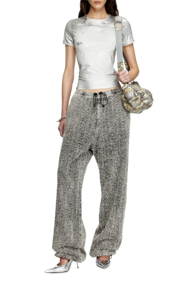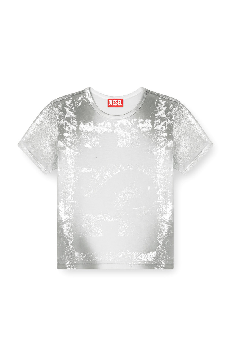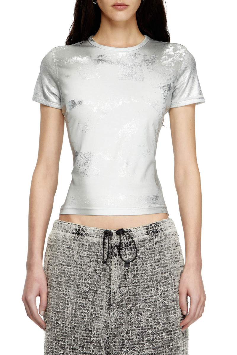 Dámske tričko s krátkym rukávom. Úzky strih. Vyrobené z bavlneného džerseja. Špeciálny prací proces a farebné nástreky dodávajú tomuto dámskemu tričku oživený mramorovaný vzhľad. Povrch je jemne fóliovaný, čím vzniká nádych kovového lesku - všimnite si negatívne logo Diesel vertikálne na prednej a zadnej strane. Modelka má na sebe veľkosť S a je vysoká 175 cm. Veľkosti sú podľa bežného značenia, pri výbere si prosím vyberte svoju bežnú veľkosť.