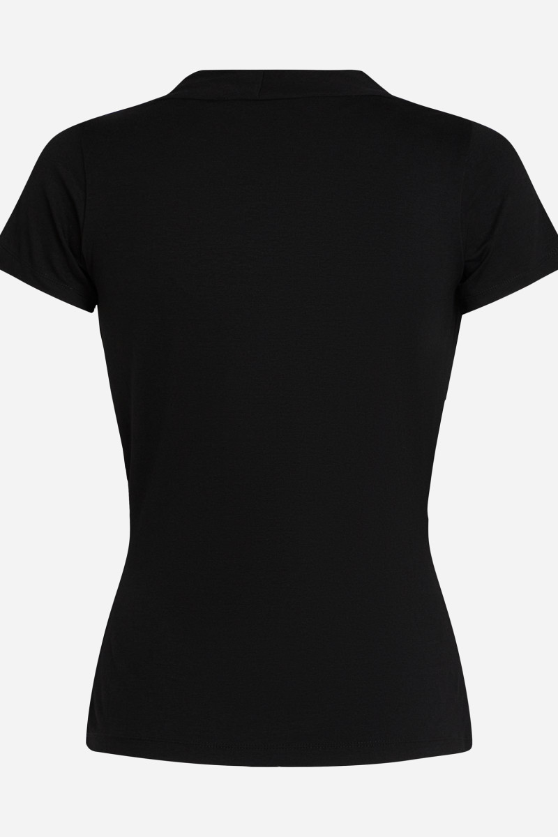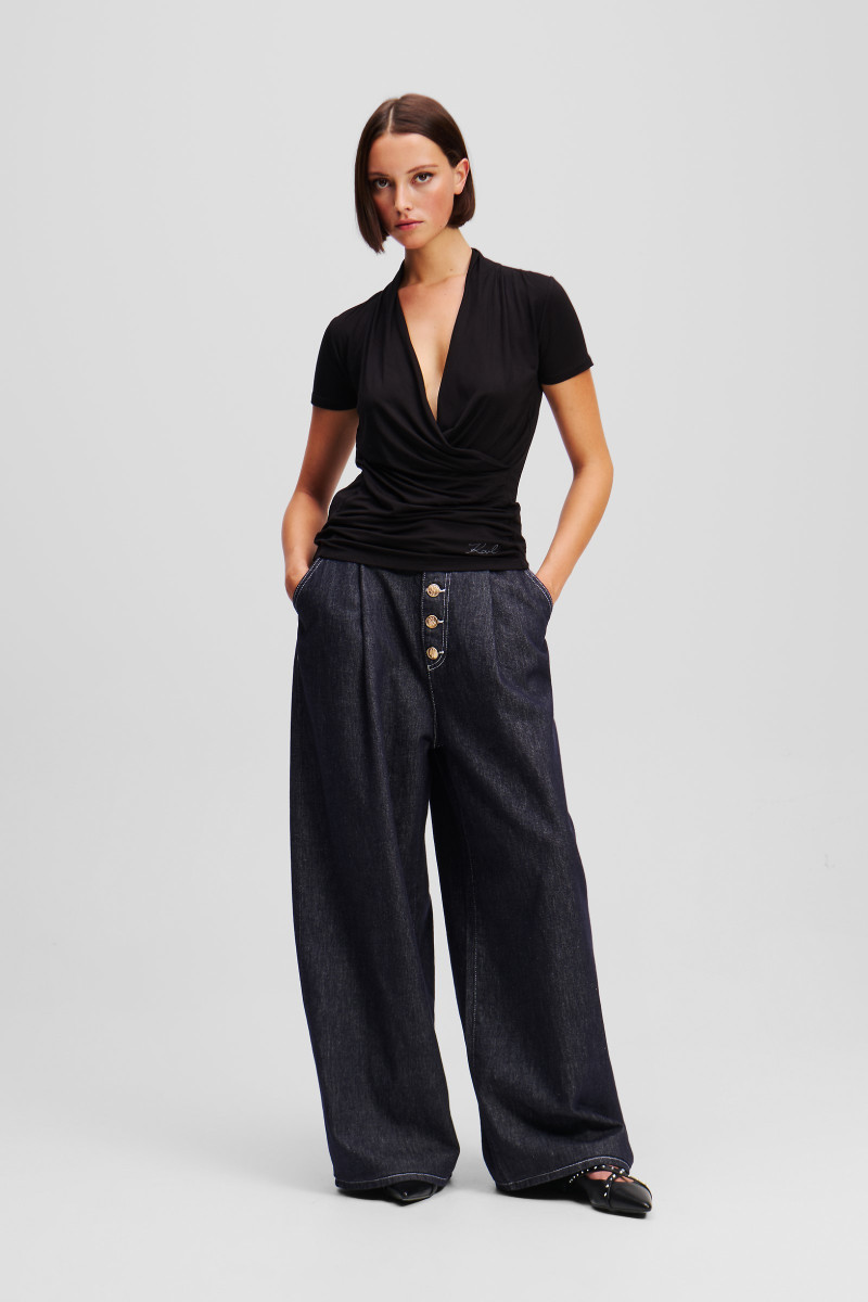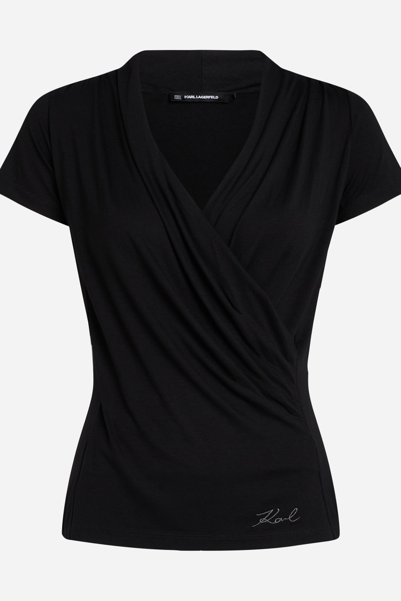 Dámske tričko s V výstrihom a krátkym rukávom. Zavinovací dizajn s hlbokým nariaseným výstrihom zdobený Karl Signature vyšívaným logom na spodnej časti. Prírodné materiálové zloženie s vysokým podielom viskózy zaručuje perfektnú splývavosť, priedušnosť a maximálny komfort pri nosení. Výborne kombinovateľný a praktický kúsok, ktorý štýlovo doladí Váš outfit.
