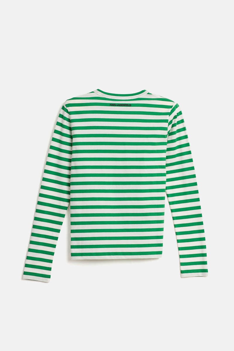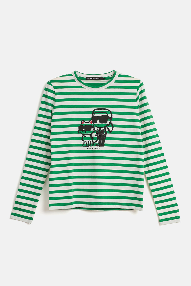 Dámske pruhované tričko rovného strihu s okrúhlym výstrihom a dlhým rukávom. Športovo-elegantný dizajn zdobený dizajnom Ikon Choupette na hrudi, ktorý obsahuje klasické siluety osviežené vylepšenými umeleckými dielami Karl. Kvalitné materiálové zloženie zaručuje dokonalú pružnosť, tvarovú stálosť a nekrčivý vzhľad. Tričko je zároveň veľmi priedušné a nenáročné na údržbu. Výborne kombinovateľný kúsok, ktorý štýlovo doladí Váš outfit.