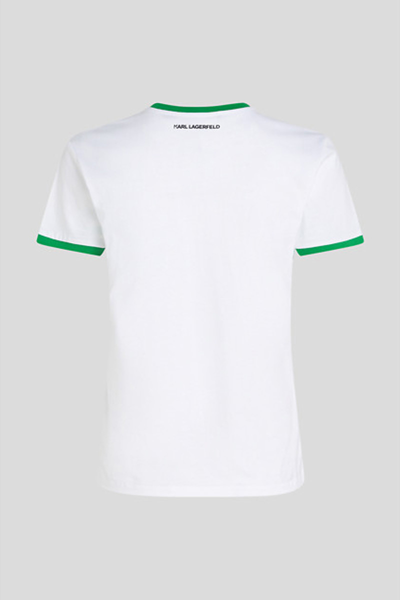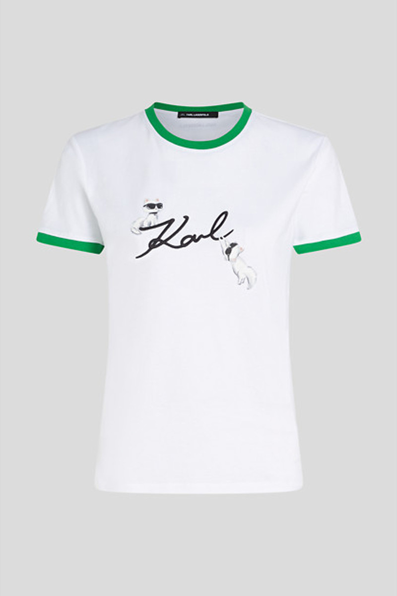 Dámske tričko klasického, rovného strihu s krátkym rukávom a s okrúhlym výstrihom. Zdobené kontrastným lemovaním na rukávoch okolo krku a logom Karl Signature s Choupette, ktoré dodávajú tomuto tričku svieži grafický nádych. Materiálové zloženie je tvorené 100% bavlneným organickým vláknom prémiovej kvality, ktoré je príjemne mäkké na dotyk, pri nosení priedušné a vďaka svojej poddajnosti a flexibilite aj veľmi pohodlné. Kvalitný džersej je zárukou tvarovej aj farebnej stálosti. Štýlový základ voľnočasového stylingu.