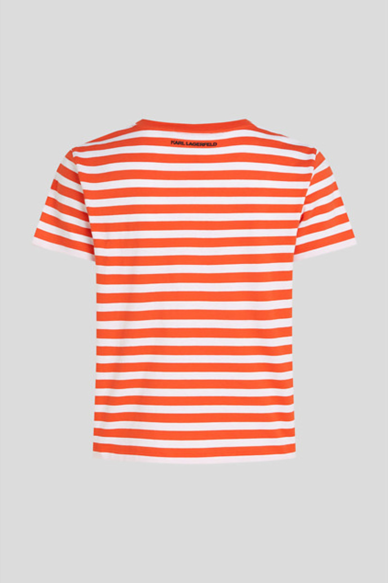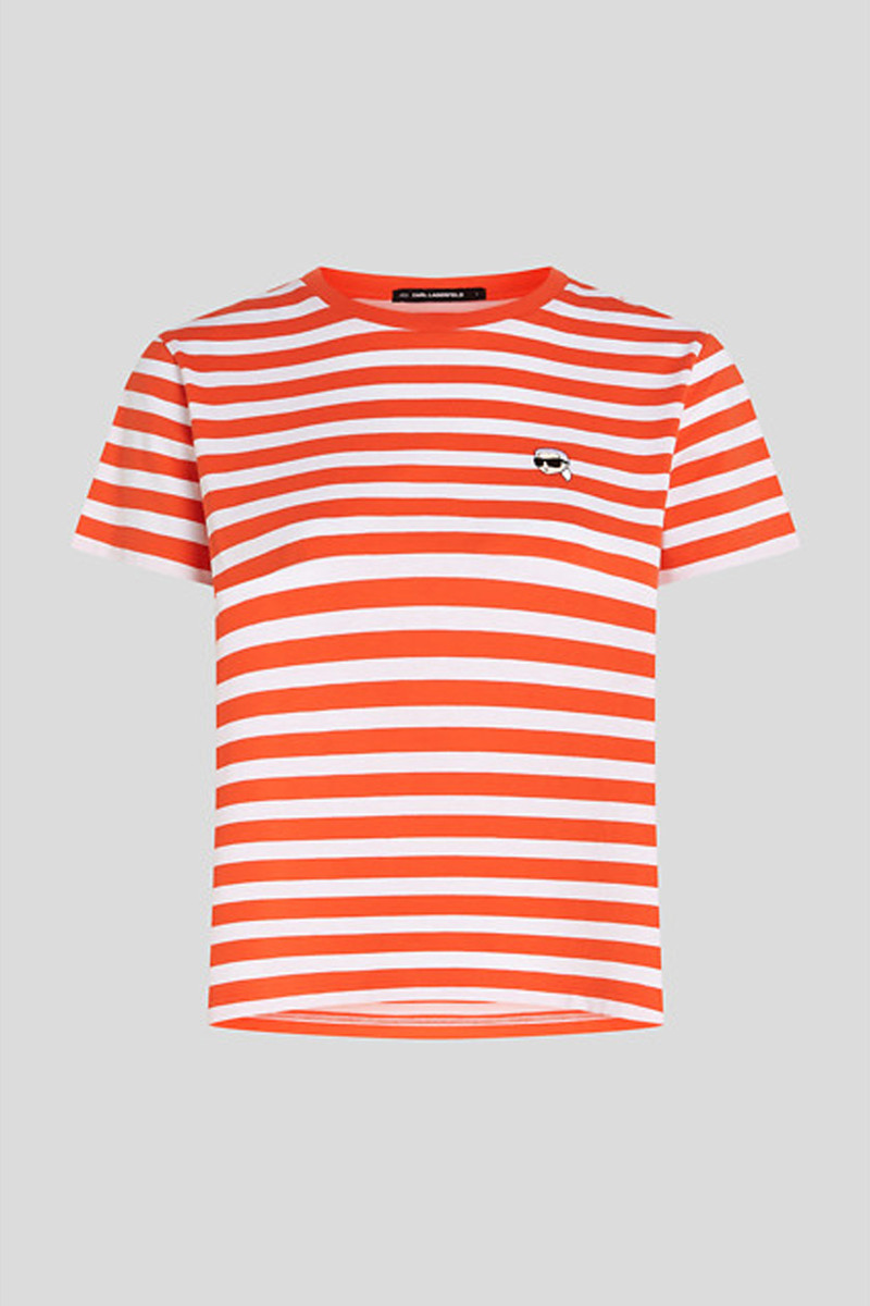 Dámske pruhované tričko rovného strihu, ktoré zdobí originálne logo Ikonik Karl vyšité na hrudi. Ležérny dizajn s okrúhlym výstrihom a krátkym rukávom dopĺňa rebrovaný lem pri krku. Ľahké materiálové zloženie so 100% podielom organickej bavlny zaručuje dokonalú priedušnosť a maximálne príjemný pocit počas nosenia. Výborne kombinovateľný a praktický kúsok, ktorý štýlovo doladí Váš letný outfit.
