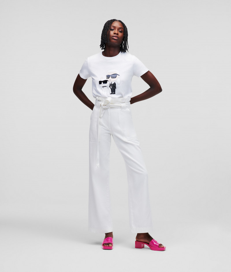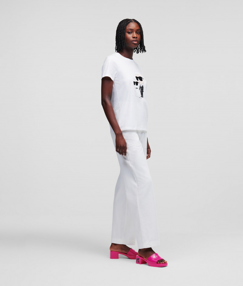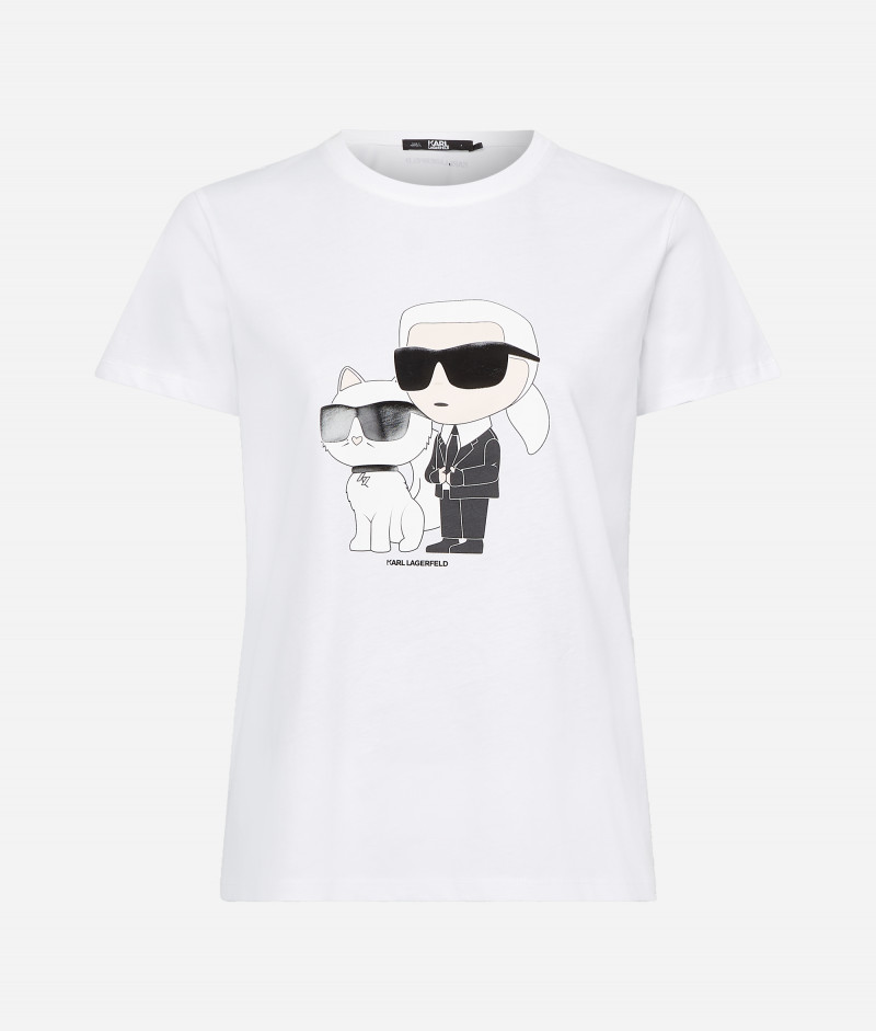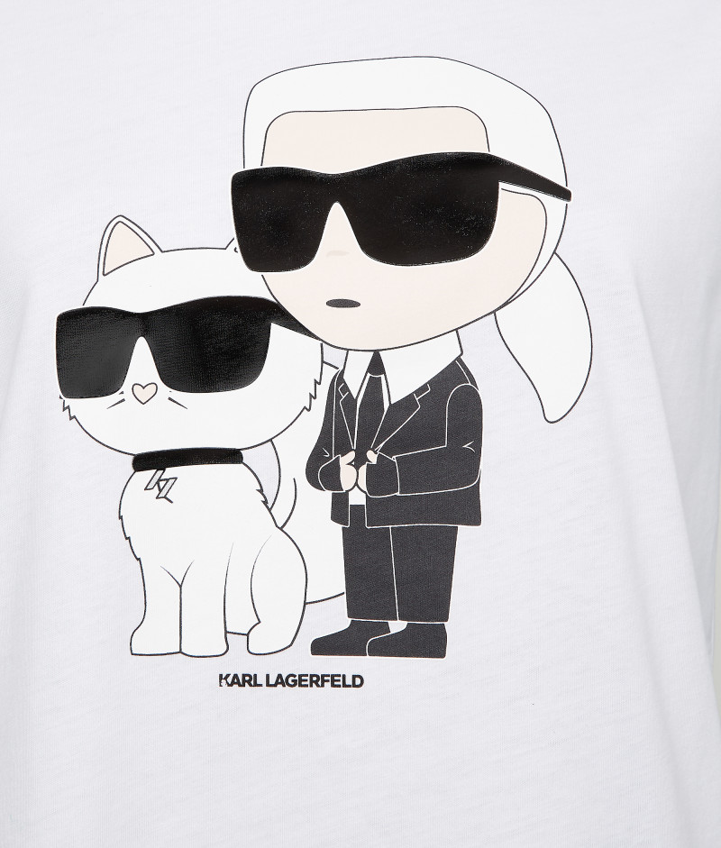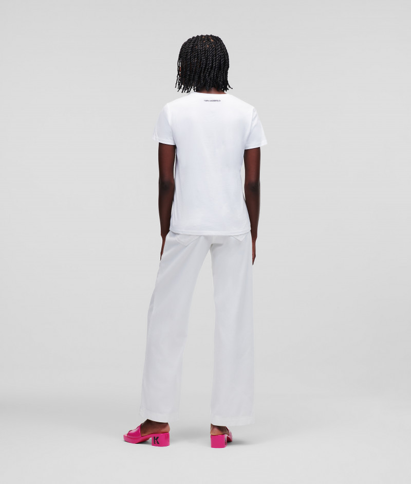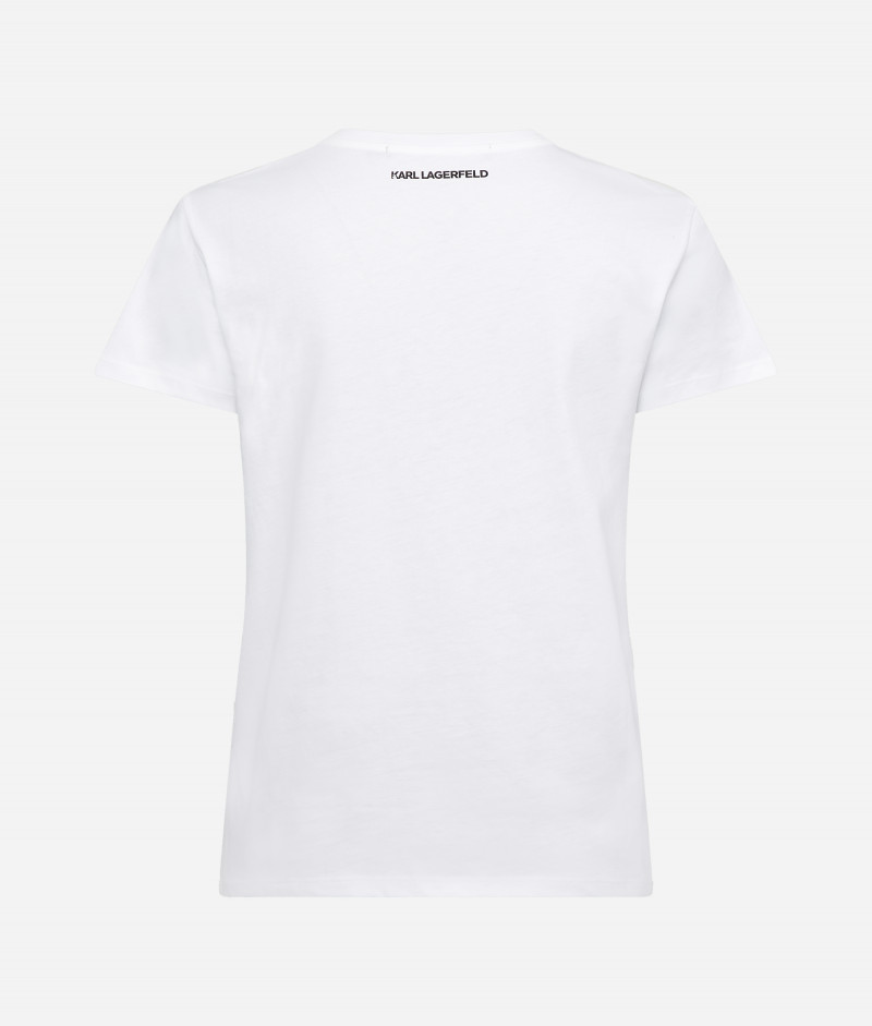 Dámske tričko s krátkym rukávom a okrúhlym výstrihom, ktoré je ozdobené novou generáciou grafiky Ikonik Karl a Choupette, inšpirovaným radom zberateľských kúskov NFT. Rovný strih s rebrovaným lemom pri krku dopĺňa kontrastnú potlač loga KARL na zadnom diele. Materiálové zloženie so 100% podielom organickej bavlny zaručuje dokonalú mäkkosť, priedušnosť a príjemný pocit pri nosení. Nezameniteľne štýlový kúsok, ktorý bude ozdobou Vášho neformálneho outfitu.