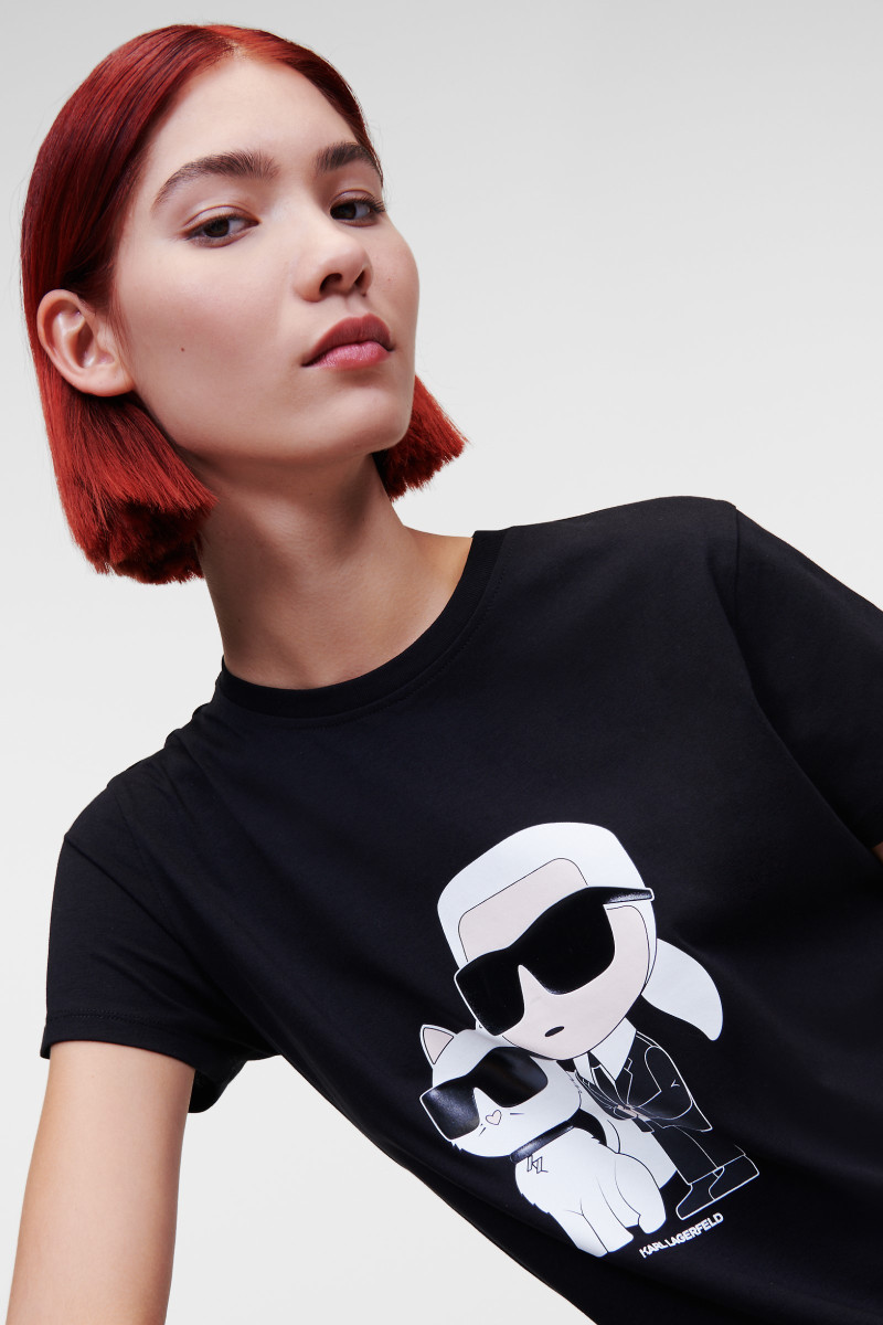 Dámske tričko s krátkym rukávom a okrúhlym výstrihom, ktoré je ozdobené novou generáciou grafiky Ikonik Karl a Choupette, inšpirovaným radom zberateľských kúskov NFT. Rovný strih s rebrovaným lemom pri krku dopĺňa kontrastnú potlač loga KARL na zadnom diele. Materiálové zloženie so 100% podielom organickej bavlny zaručuje dokonalú mäkkosť, priedušnosť a príjemný pocit pri nosení. Nezameniteľne štýlový kúsok, ktorý bude ozdobou Vášho neformálneho outfitu.