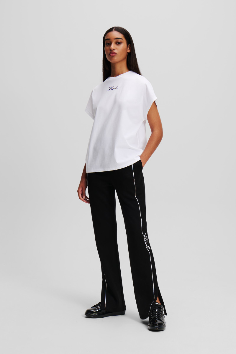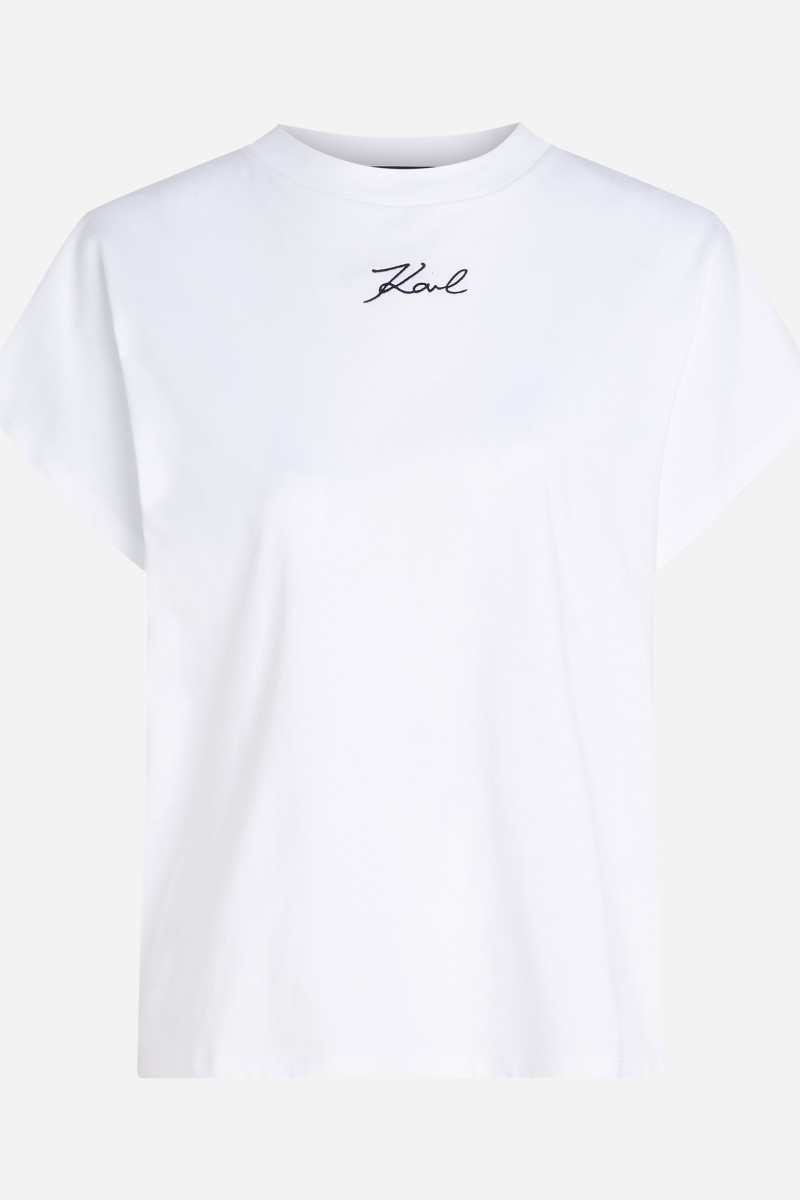 Dámske tričko s uvoľnenými padnutými ramenami a okrúhlym výstrihom v rovnom strihu. Predná strana je zdobená s jemným vyšívaným kontrastným logom Karl Signature. Materiálové zloženie je tvorené 100% bavlneným vláknom prémiovej kvality, ktoré je príjemne mäkké na dotyk, pri nosení priedušné a vďaka svojej poddajnosti a flexibilite aj veľmi pohodlné. Kvalitný džersej je zárukou tvarovej aj farebnej stálosti. Nezameniteľne štýlový kúsok, ktorý bude ozdobou Vášho neformálneho outfitu.